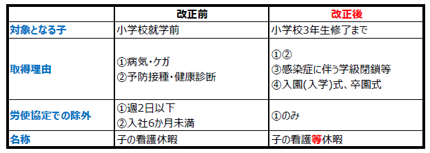 この制度は小学校就学前の子どもを育てている従業員は病院に連れていく等の理由で子ども1人につき年に5日、2人以上であれば10日間子の看護休暇というものを取得できます。これも今まであった制度ですが今回の改正でどのように変わるのか見ていきましょう。