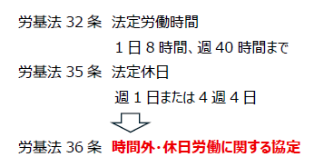32条・35条の内容を超えて労働させることは違反となり罰則もあります。現実には残業や休日労働がある会社は存在しており、罰則を受けないためには労基法36条で「時間外・休日労働に関する協定」を締結し管轄の労働基準監督署に届出すれば法定労働時間を超えて労働させること(残業)、法定休日に労働させること(休日出勤)が可能となります。この協定が労基法36条に基づくものなので通称「36協定」と呼ばれています。この協定は所定の様式があり書き方や細かい部分の注意点はあるのですが、こちらについては別動画でご紹介したいと思っていますので今回の動画では36協定とは何なのか、どういうところに注意しなければならないのかを解説していきます。