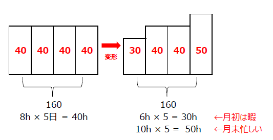 そして図を見ていただければこの変形労働時間制の変形ということの意味がイメージしやすいと思い掲載していますが、左図のように原則の形は4週あって週40時間ですから綺麗な長方形ができます。また右図のように第1週目は30時間、月末の第4週目は50時間というように設計するとデコボコした形になります。それが変形して見えるので変形労働時間制と考えて頂ければ覚えやすいかと思います。