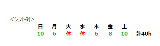 先ほど例を挙げた業種は週末などが忙しいことが多いので土日にお休みというケースは少ないかもしれません。そこをイメージして今回の図では土日の勤務時間を多くしています。図のように週の合計40時間以内を守っていれば問題ありません。