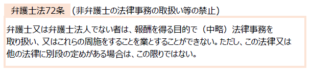 この条文は要するに弁護士ではない人が法律事務を取り扱うような業務を行ってはダメということです。今回の退職代行に絡んでお伝えすると、どういうことが法律事務に含まれるかということですが、退職日の交渉・見払賃金の請求・有休取得の交渉などです。弁護士がやるような仕事で報酬を得たり、弁護士を紹介したりすることをビジネスとしてすることを非弁行為といいます。一応但し書きがあって、除外規程があります。除外規程に記載がない限り、非弁行為を行うと罰則があります。これが前提知識となりますので覚えていてください。