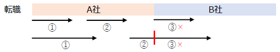 次に下の矢印です。A社で育休を1回取得し、一旦復帰して2回目の育休を取得している間に転職した場合になりますが、転職した時点でリセットされてしまうためB社で育休を取得しようとしても3回目のカウントとなります。