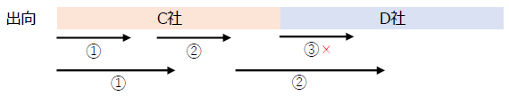 例②:C社からD社へ出向した場合(転籍出向・一定の在籍出向のケース)