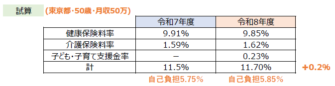 上図の通り健康保険料が下がることで嬉しい!となるはずが、トータルすると11.5%だったものが11.7%になるので0.2%増えていることがわかります。ですから保険料としてトータルで見てみると保険料は下がりません。例を挙げた東京都・50歳・月収50万の方で実際に計算してみると月で500円、年間で6000円の保険料アップとなります。